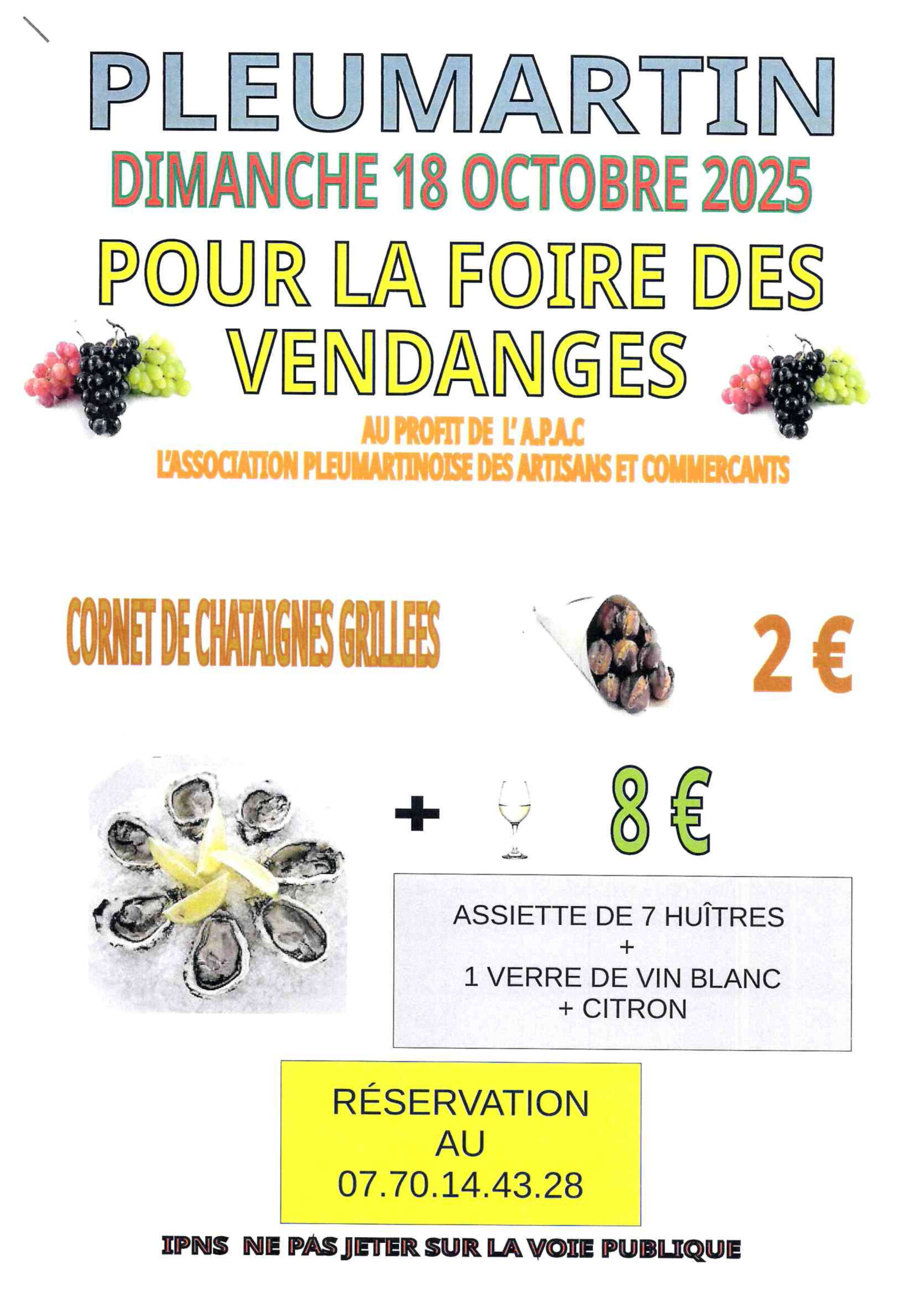 Le comité des fêtes organise la foire des vendanges, ce dimanche 19 octobre, avec une brocante et vide-grenier, une randonnée pédestre au profit d’octobre rose, une course pour enfants, des animations, une buvette et de la restauration.A cette occasion, l’APAC, association des commerçants et artisans, propose des cornets de châtaignes grillées et assiettes d’huîtres.Ce dimanche, […]