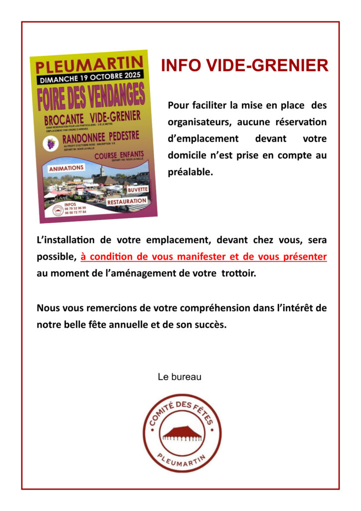 Le comité des fêtes organise la foire des vendanges, ce dimanche 19 octobre, avec une brocante et vide-grenier, une randonnée pédestre au profit d’octobre rose, une course pour enfants, des animations, une buvette et de la restauration.
