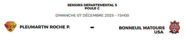 1 décembre 2025 Actualités Dimanche 7 décembre : match de football Le dimanche 7 décembre, à 15H, au complexe sportif Guy Jugla, le Pleumartin La Roche-Posay Football Club reçoit l’équipe de Bonneuil-Matours.